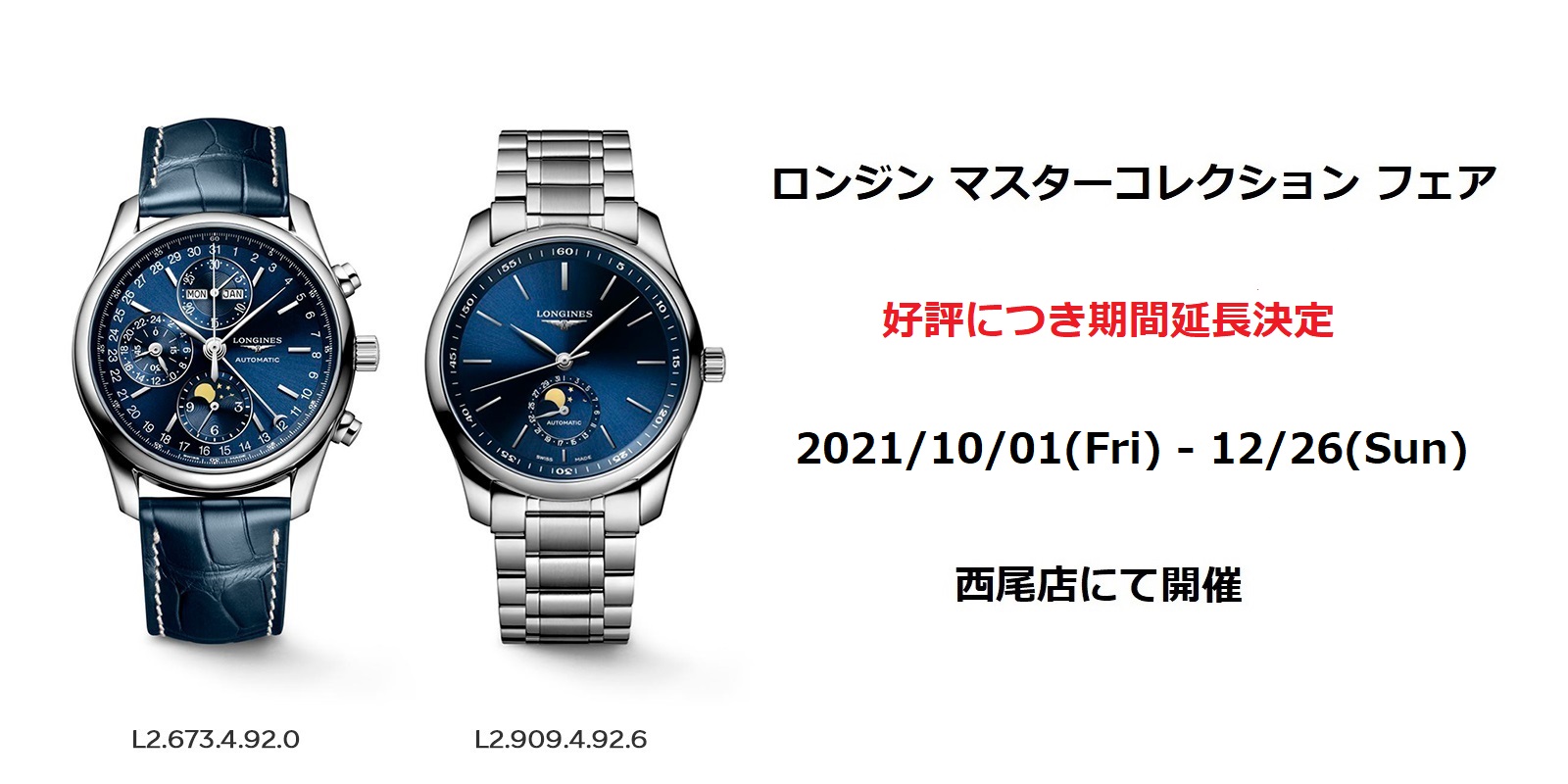 【ロンジン マスターコレクション JAPAN SPECIAL】約190年に及ぶロンジンの歴史とエレガンスを象徴する「ロンジン マスターコレクション」。同コレクションを代表する2つのモデル(L2.673.4.92.0,L2.909.4.92.6)を期間中にご購入頂くと、シックなブラックアリゲーターレザーストラップが付属します。さらに、オリジナルノベルティもプレゼント(無くなり次第終了となります)※2021年12月26日(日)までの販売分が対象となります。