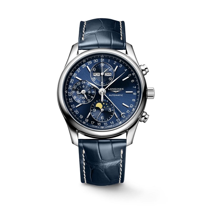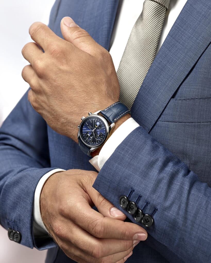クロノグラフモデルには文字盤と同色系のブルーアリゲーターレザーストラップがコーディネートされ、知的で重厚感のあるデザインに。クロノグラフ機能をはじめとする本格的機械式時計の複雑機能を堪能することができるモデルです。