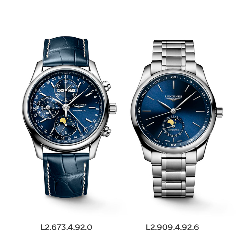 ロンジンマスターコレクションJAPAN SPECIALは、いずれも6時位置に配置されたムーンフェイズ機能が特徴的。上品なブルーの文字盤にはサンレイ加工が施され、角度によって美しく光を反射し、品格を感じさせながらもスタイリッシュな印象を与えます。