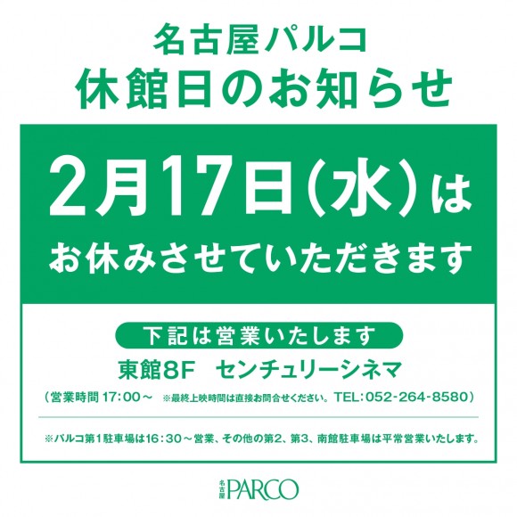 2月17日(水)は名古屋パルコ全館休館日に伴い、