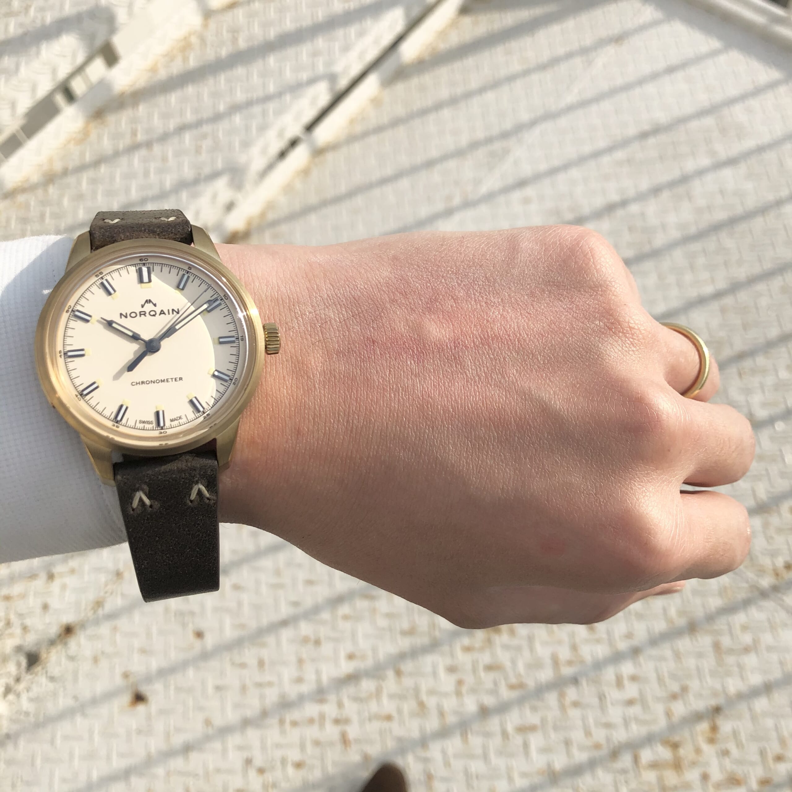 ゴールドよりも温かみのある雰囲気のブロンズケースを採用し、