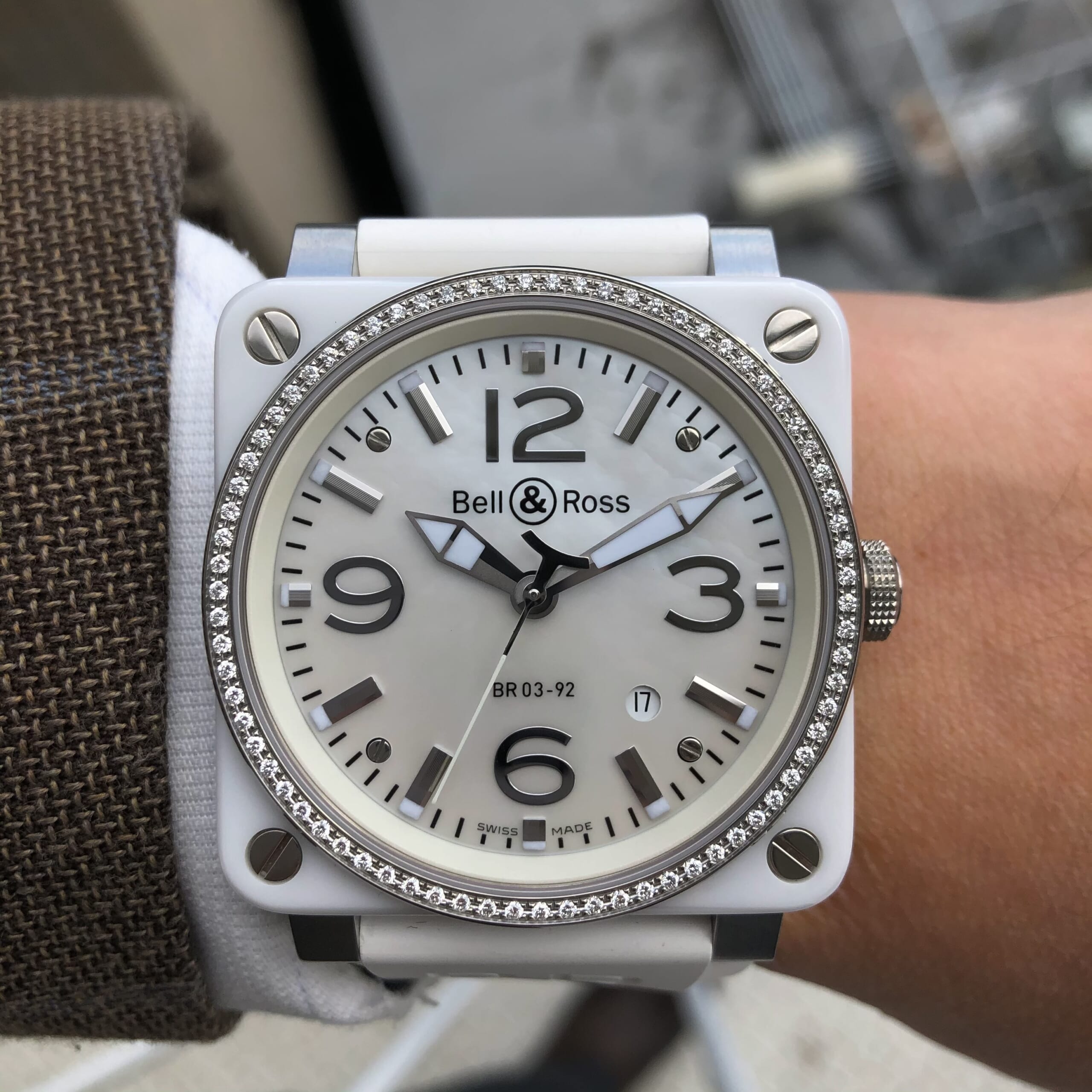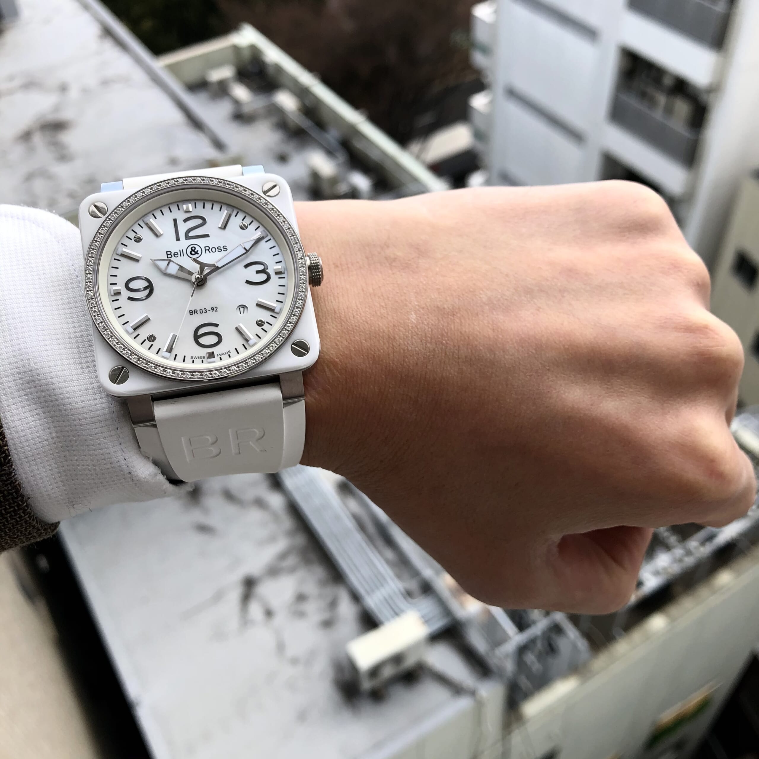 白のセラミックのベゼルに、