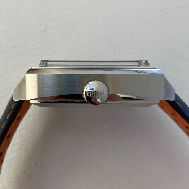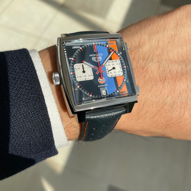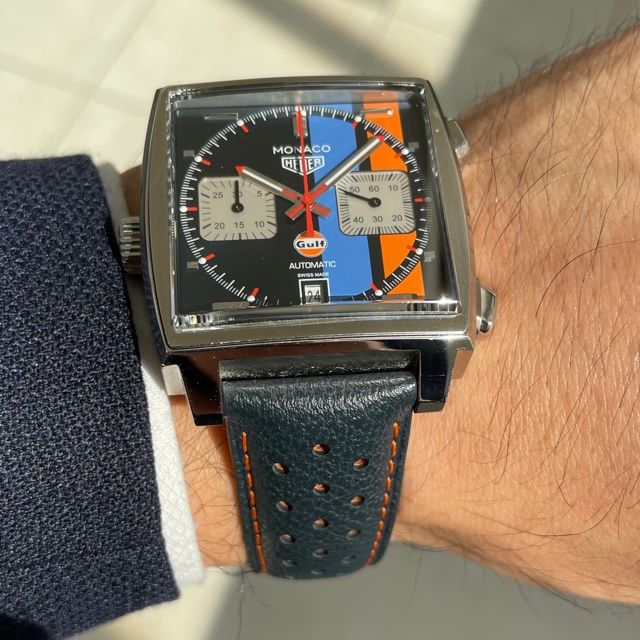 文字盤を縦に走る水色とオレンジのカラーリングが最大の魅力のモナコ キャリバー11 クロノグラフ ガルフ エディション