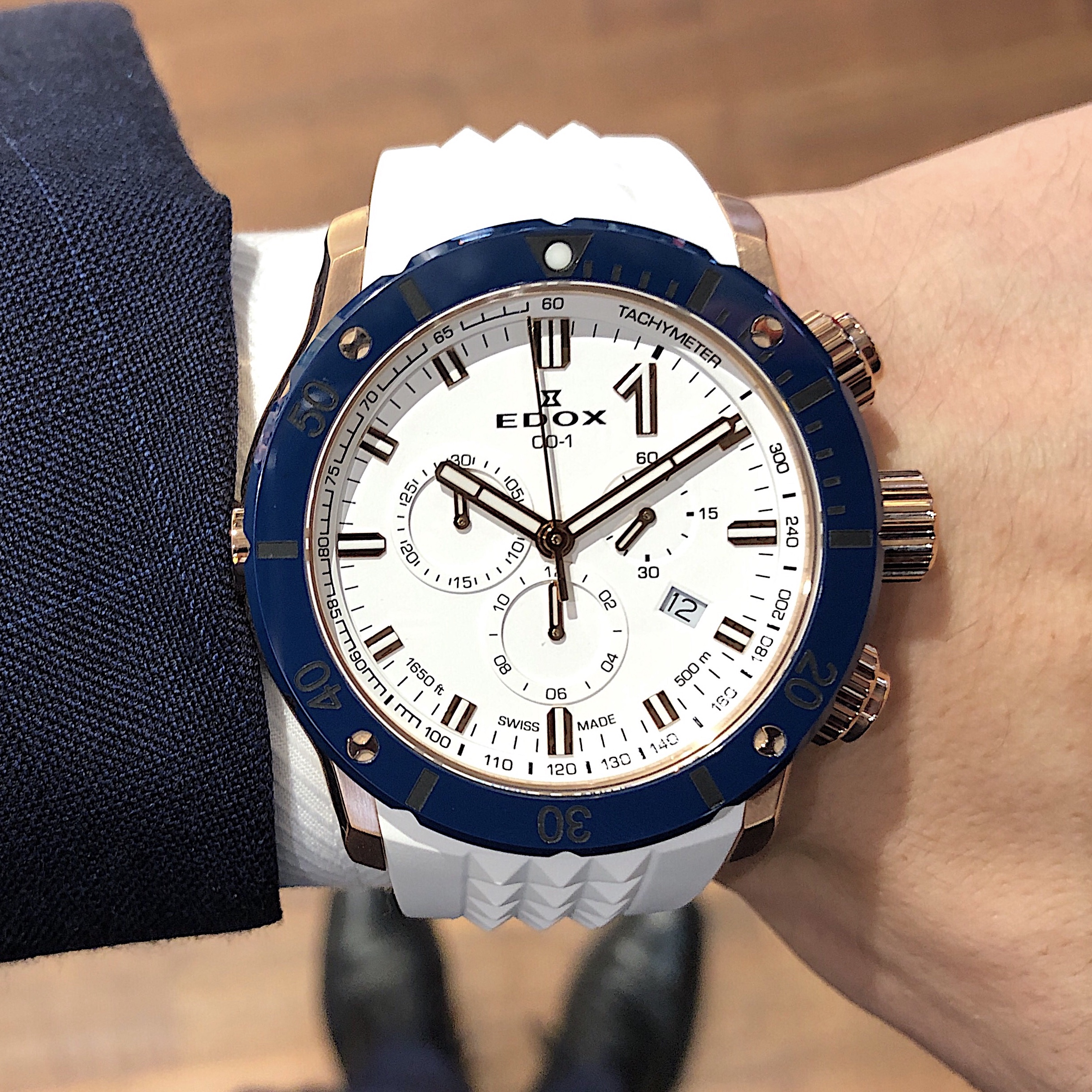 ケースにローズゴールドPVD加工を施し、白・青・金のコントラストを出すことでラグジュアリースポーツウォッチと呼べるデザインを実現させました!