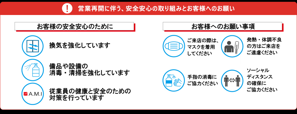 感染症予防対策は万全に皆様に安心してお買い物を出来るよう努めております。