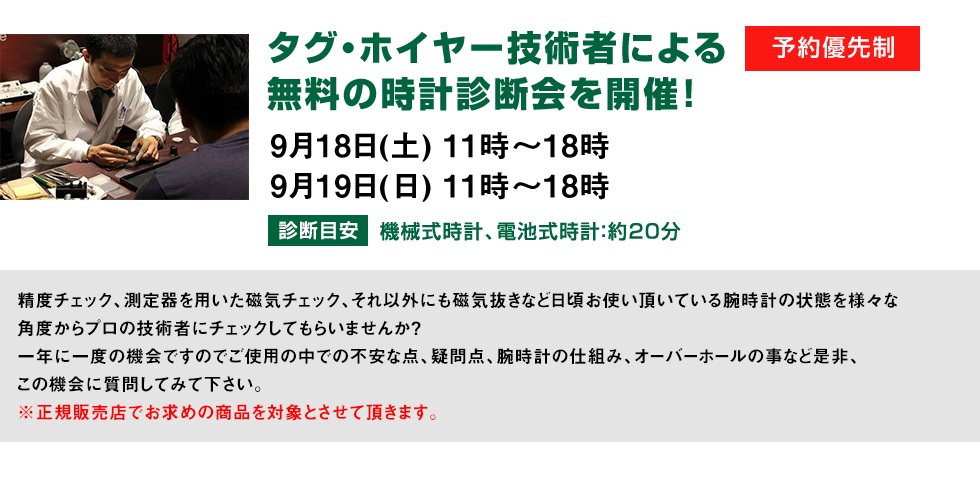 タグ・ホイヤーをお持ちのお客様は自動巻きモデル、クォーツモデルに関係なく気軽にご予約下さい。