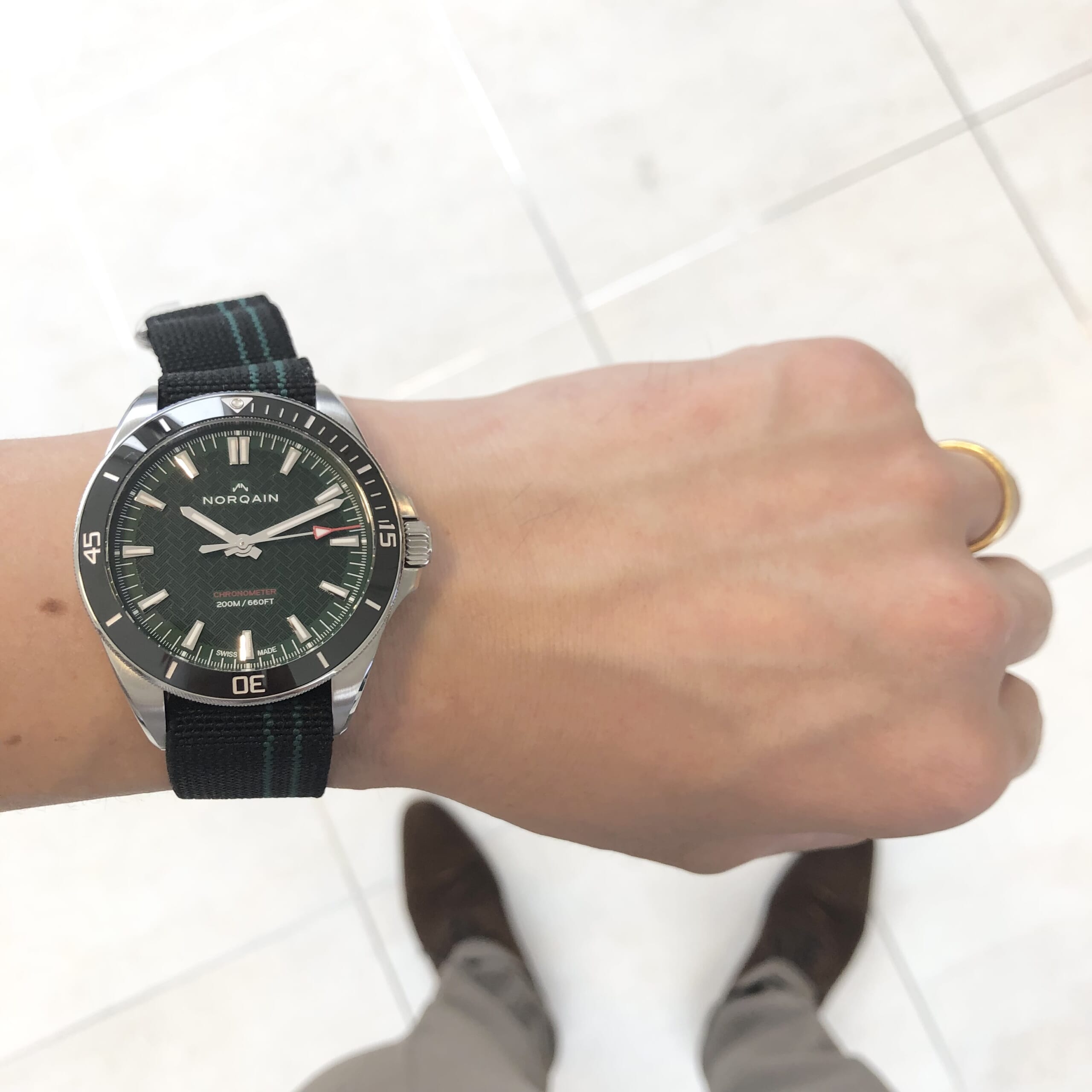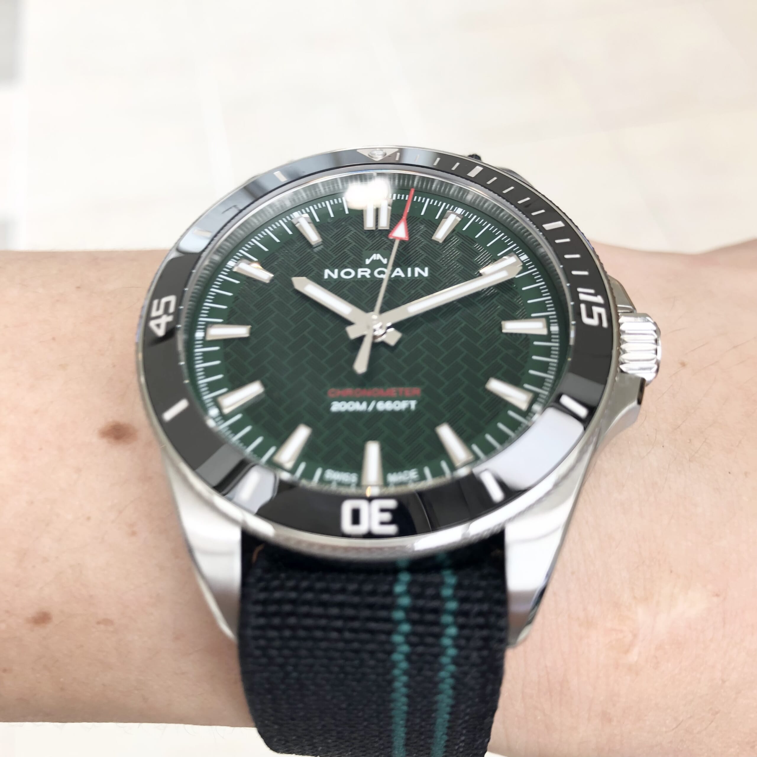 文字盤はフォレストグリーンとブラックの2色で構成され、
