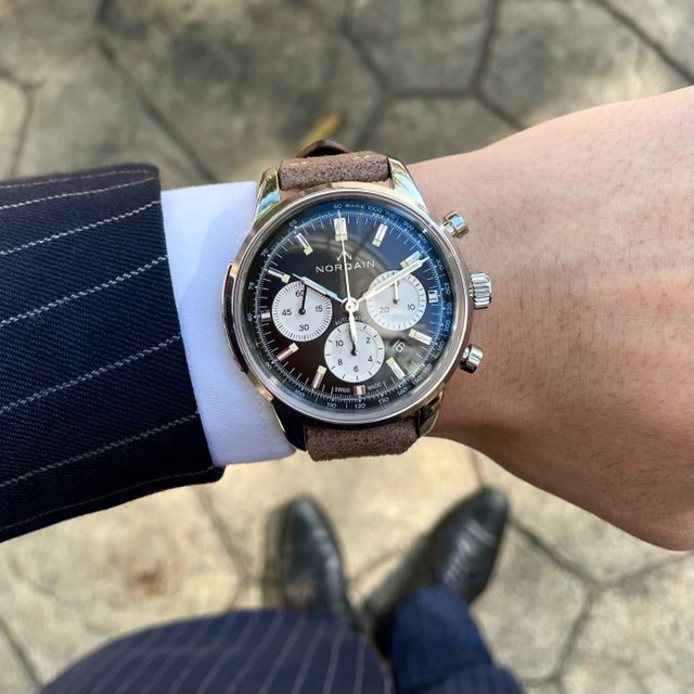 ノルケインフリーダム60はスーツでお仕事をされる方の身だしなみとしてもお勧めしたい1本です。ヴィンテージ仕上げのブラウンレザーベルトが大人な雰囲気を演出してくれるため、スーツスタイルとの相性抜群です。