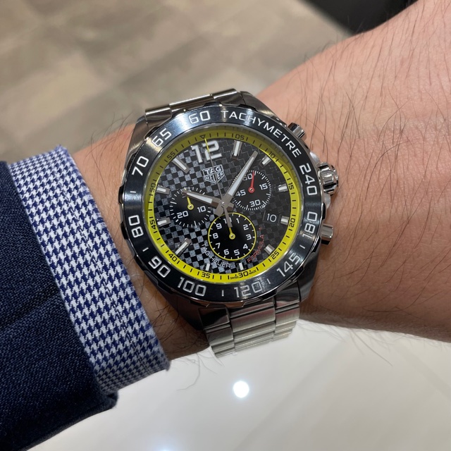 昨年、登場したチェッカーフラッグ柄の文字盤、外周目盛りに鮮やかなイエローを採用した人気のクロノグラフです。