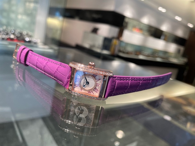 都築一押しのポイントは・・・ベゼルと文字盤にあしらったダイヤモンド!!ケースには34石のダイヤモンド、文字盤には35石のダイヤモンドを並べた贅沢なデザインです。また神秘的なマザーオブパールを使った文字盤は唯一無二です!!そして他の人と差をつけれるのがインデックスお色味