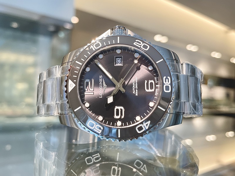 「ハイドロコンクエスト」はロンジンが誇るプロフェッショナルダイバーズシリーズです。2018年にデザインがリニューアルされ、細部のデザインもよりすっきりとスタイリッシュになりました。ベゼルはセラミック製に変更となり、文字盤に合わせた色が採用されています。セラミックベゼルは、優れた耐傷性&耐退色性により、いつまでも美しい輝きを保ちます。そして、新しく追加されたカラーがこちらのグレー文字盤。光沢感のあるグレーの文字盤はとても綺麗な色味で、セラミックの艶感と相まって都会的でスタイリッシュな雰囲気を持っています。その他、ベゼルの目盛りがフラットに表現され、インデックスを若干細めにするなど、よりすっきりとした印象なりました。もちろん、リューズやケースバックをねじ込み式にする事で、300mの高い防水性能を誇るなど、本格的なダイバーズとしてのスペックはすべて継承しています。針やアラビアインデックス、丸型のアワーマーカーにはスーパールミノバが塗付され、暗闇での視認性は抜群です。搭載するムーブメントは、約64時間のロングパワーリザーブを備える他、なんと、