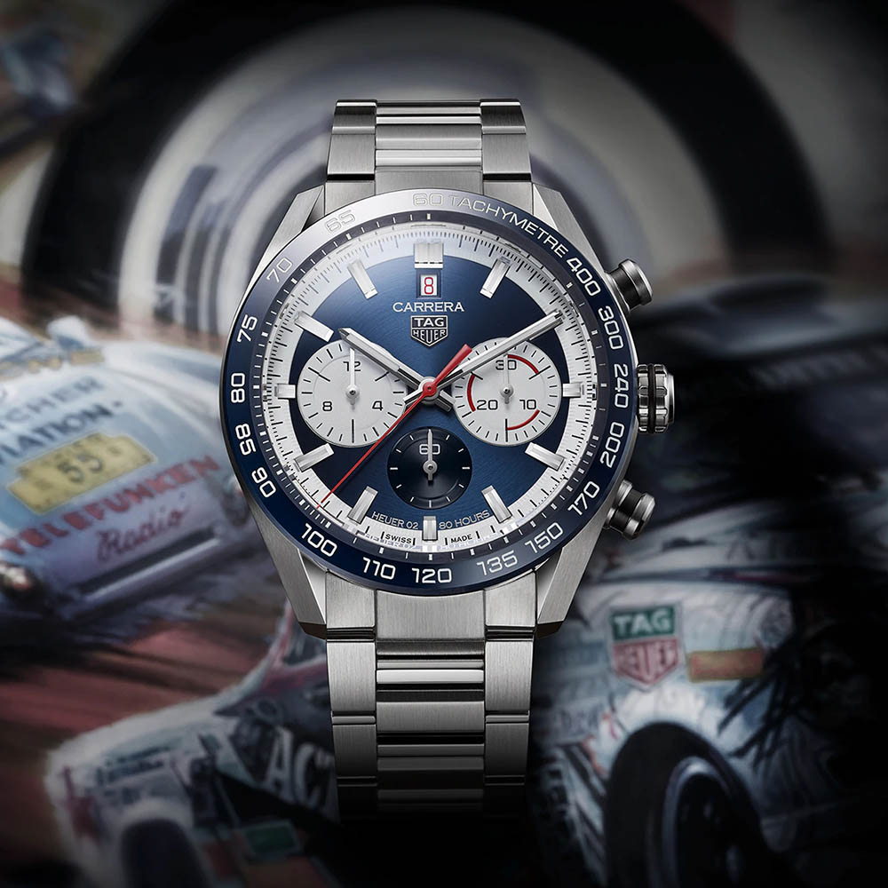 タグ・ホイヤーでは唯一の12時位置に日付を配置し、約80時間のパワーリザーブを誇る自社製ムーブメント「キャリバー ホイヤー02」を搭載