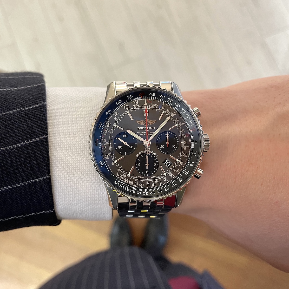 定番色ではない配色だからこそ腕元を個性的に飾ることができる特別なナビタイマーです。