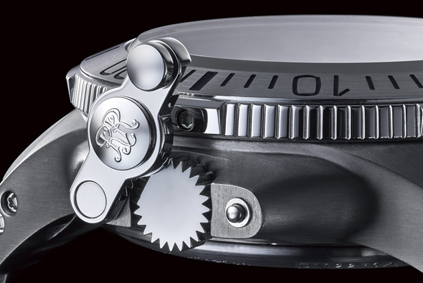 リューズを正確な位置までねじ込んで、プロテクション・プレートを下して固定する。これだけで機械式時計の弱点であるリューズを守りながら、防水性や耐衝撃性を高めます。