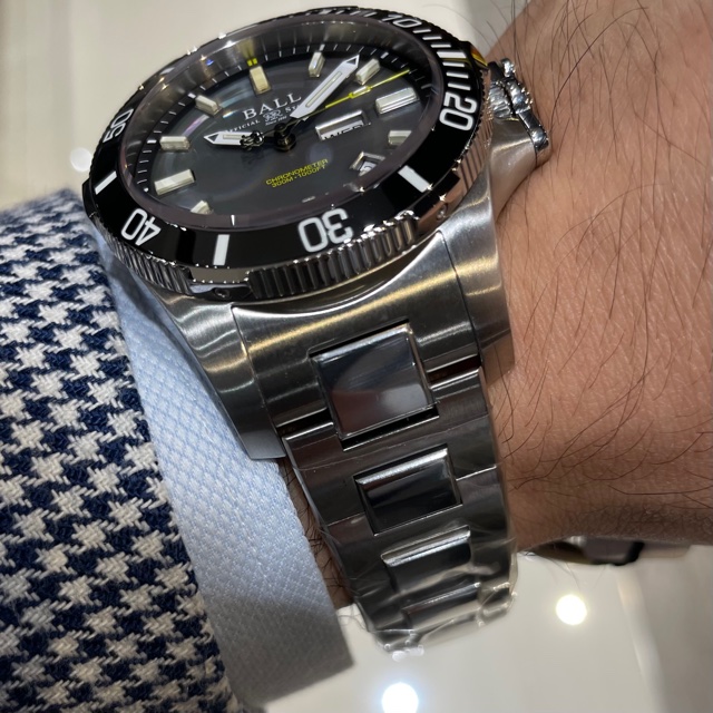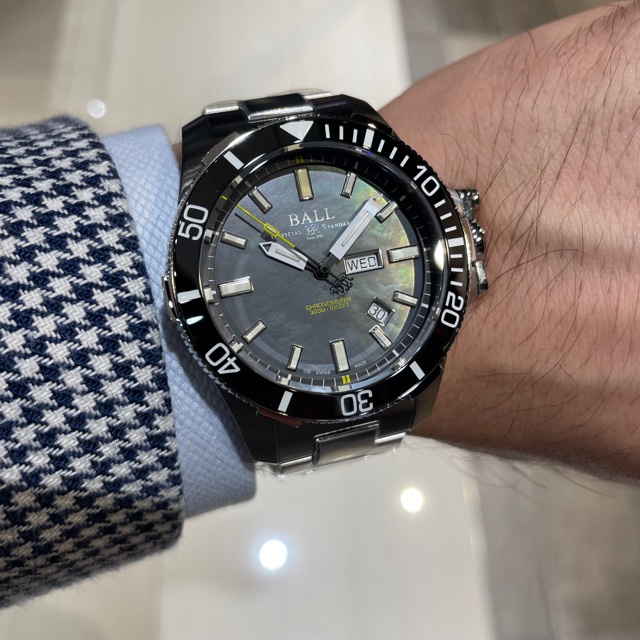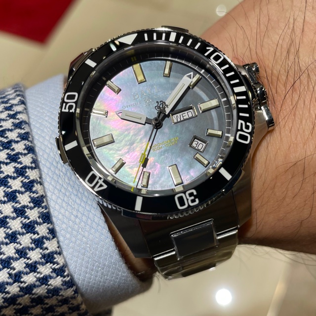 ボール ウォッチが誇る数々の独自テクノロジーを集約し、耐衝撃性・耐磁性・防水性・視認性において他の追随を許さない圧倒的なスペックを実現した「サブマリン ウォーフェア」から、光の加減で虹色の神秘的な光沢をもたらす「マザー・オブ・パール」を文字盤に採用した日本限定100本のモデル。ムーブメントはスイスの公的機関であるC.O.S.Cによって検査・合格したクロノメーター・ムーブメントを搭載しています。