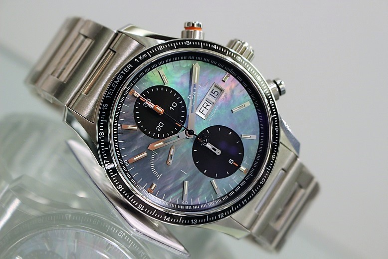 “竜巻を追う者”=ストームチェイサーのために作られたタフで視認性の高いモデルをベースに、日本限定100本として登場したのがコチラ!!文字盤にMOP(マザー・オブ・パール)を使用し、エレガントな要素が加わりました。真珠母貝が素材のMOPは光の当たり具合でその表情を幾重にも変え、また一つ一つ色味や模様が異なる天然素材は世界で二つとして同じものはないという特別感もあります。元々人気の高い『ストームチェイサープロ』が魅惑的でエレガントなMOP文字盤をそなえ、日本限定100本と生産本数がとても少なく希少とくれば…人気が出る事間違いないですね!!完売してしまう前に、ぜひ店頭で実物をご確認ください!!