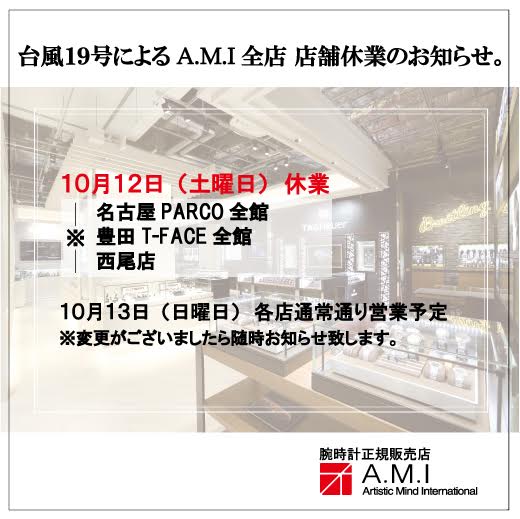 2019.10.11明日12日(土)の営業に関して! 未分類明日12日(土)の営業に関して!台風19号の接近に伴いA.M.I全店、休業となります。ご迷惑をお掛けしますが何卒宜しくお願い致します。 Tweet Share Hatena Pocket Pin it この記事のタイトルとURLをコピーする 遂にカレラ ホイヤー02 クロノグラフ ブルーエディションが店頭に並びました!前の記事 話題のジンの限定モデルサンプル期間限定入荷!次の記事 野間口 慶太【取得資格】 CWC 上級認定ウォッチコーディネーター ブライトリング セールスマスター メカニカルクロノグラフマスター トップガン