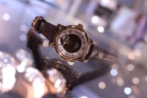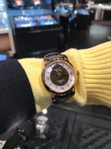 12時位置の花と同じ形が型押しされています!濃い目のブラウンとローズゴールドのケースが一層華やかに腕元を彩ります!