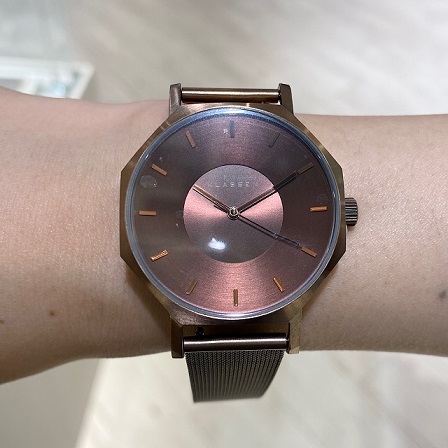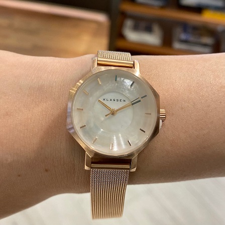 丸形にはない角張ったデザインではありますが、小振りなサイズ間にメッシュ調のブレスが大人っぽくて素敵です!