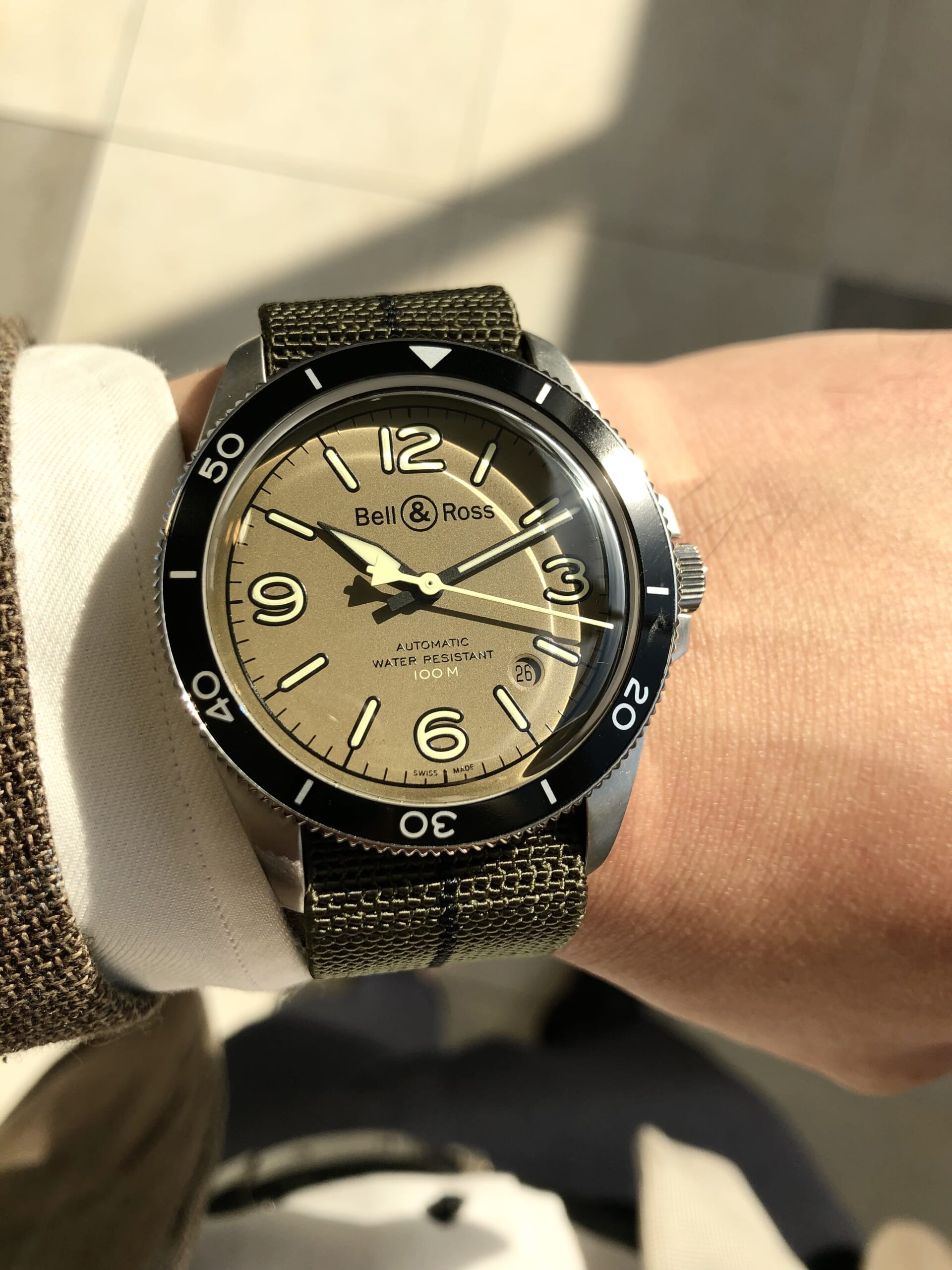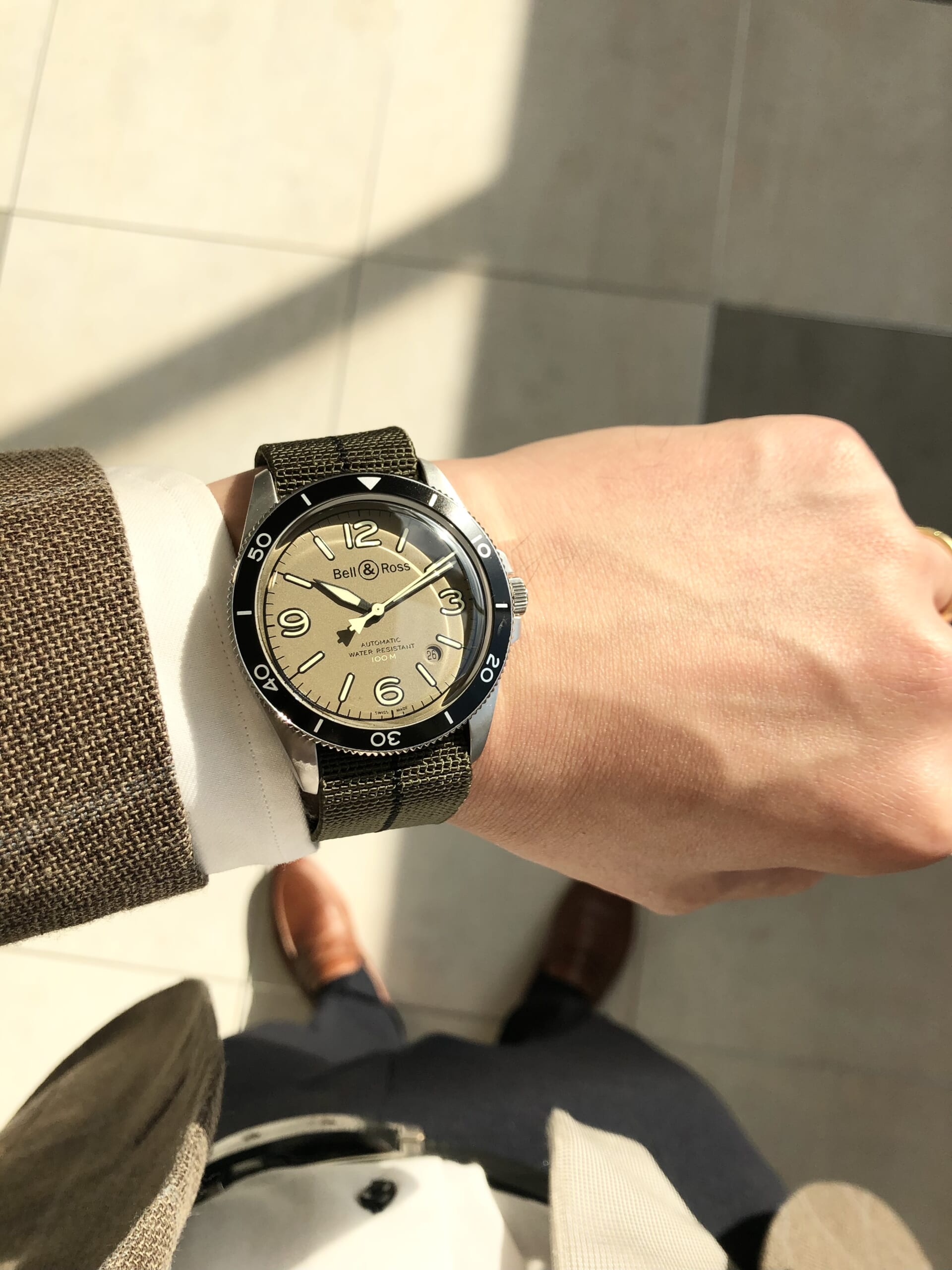 カーキの文字盤と