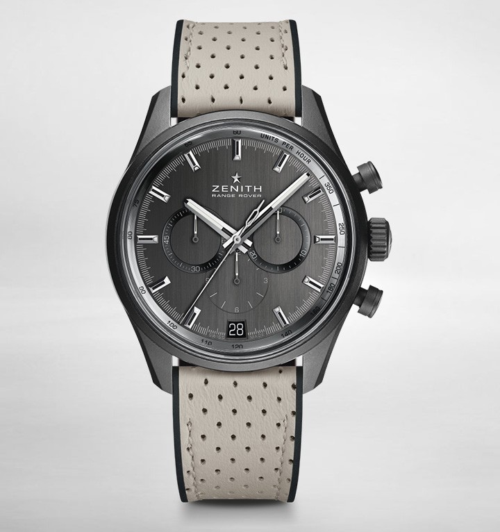 漆黒のケースに漆黒のダイアル、そこに誇らしく刻まれたゼニスとレンジローバーの名。