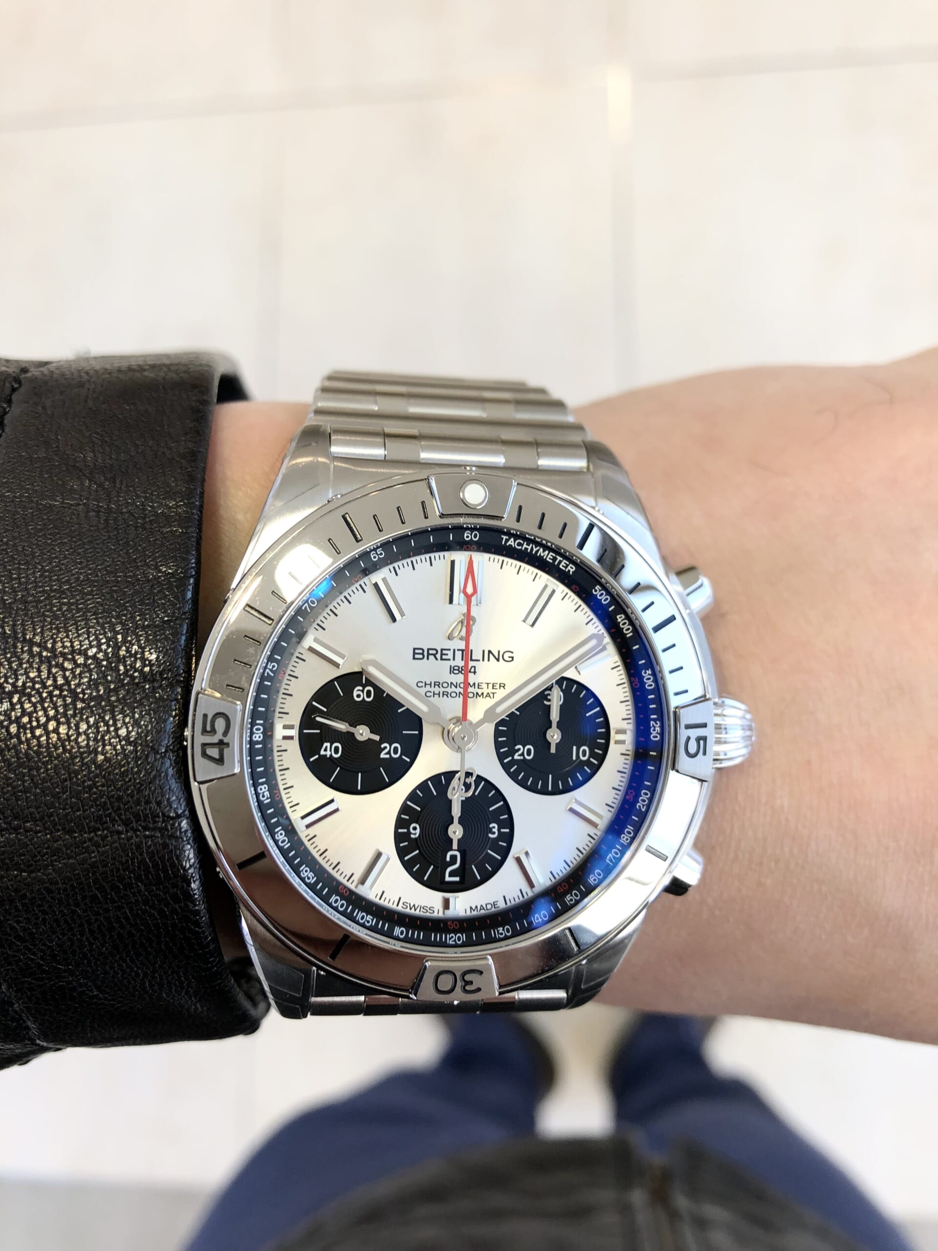 男らしいスタイルに、 腕元はさりげなくブライトリング。というのにぴったりなクロノマット。