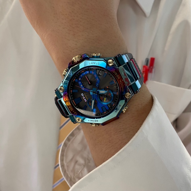 ベゼルとケースの両方にレインボーIPが施されたデザインはインパクト大の特別感溢れる1本ですね!I様にとっては念願のレインボーMT-Gという事で、今回は真っ先にお問合せを頂きました!