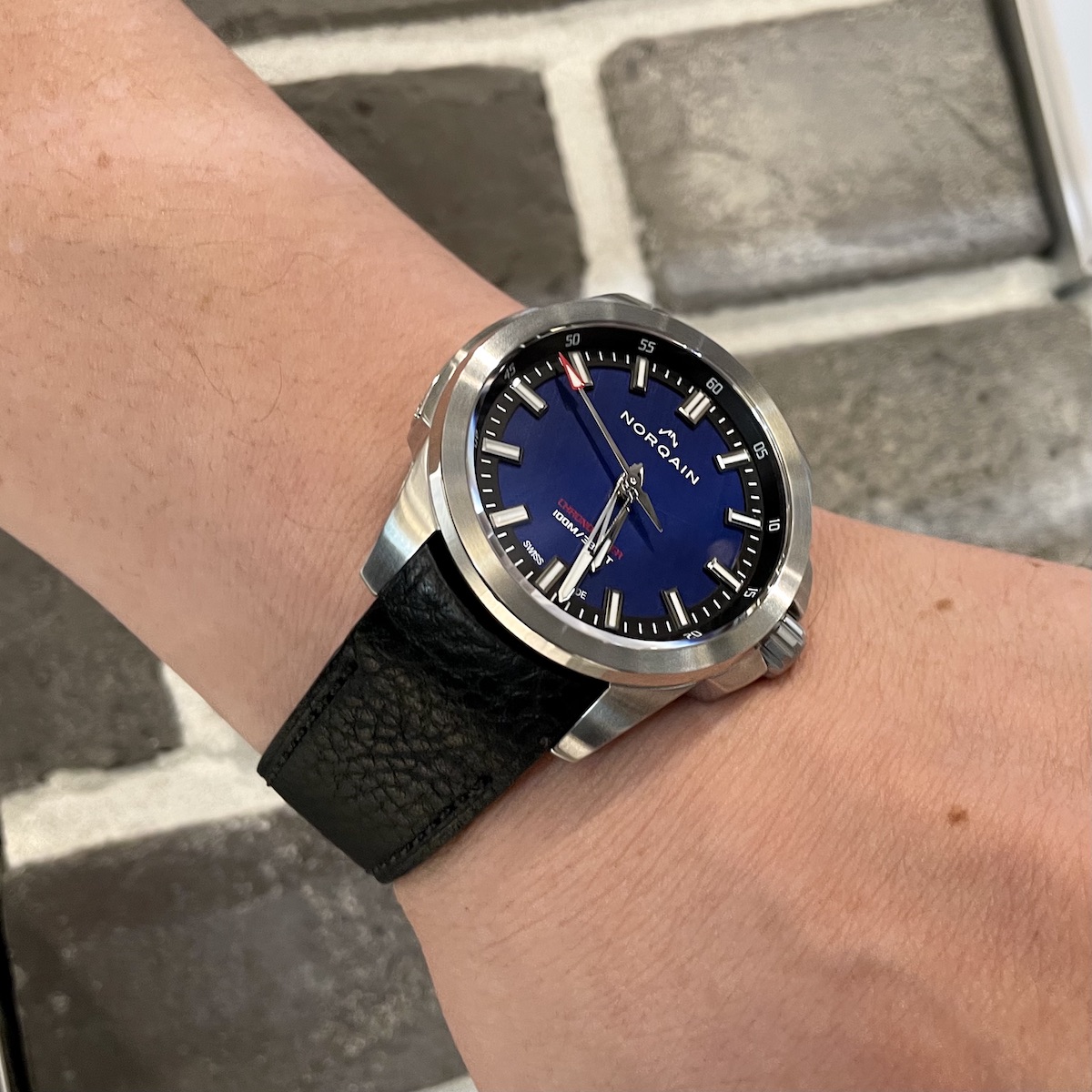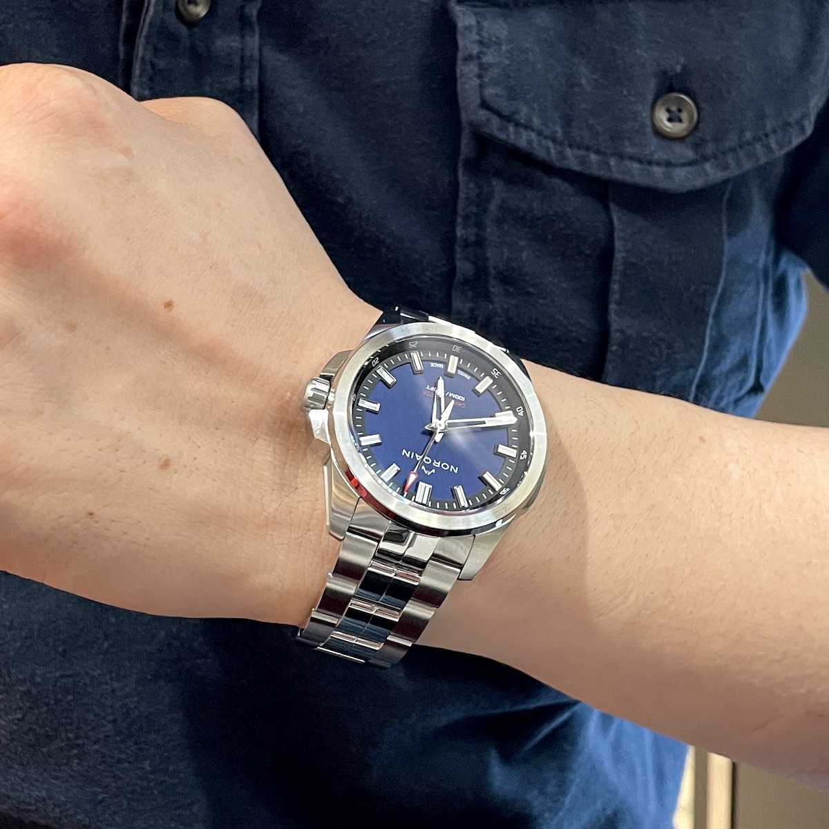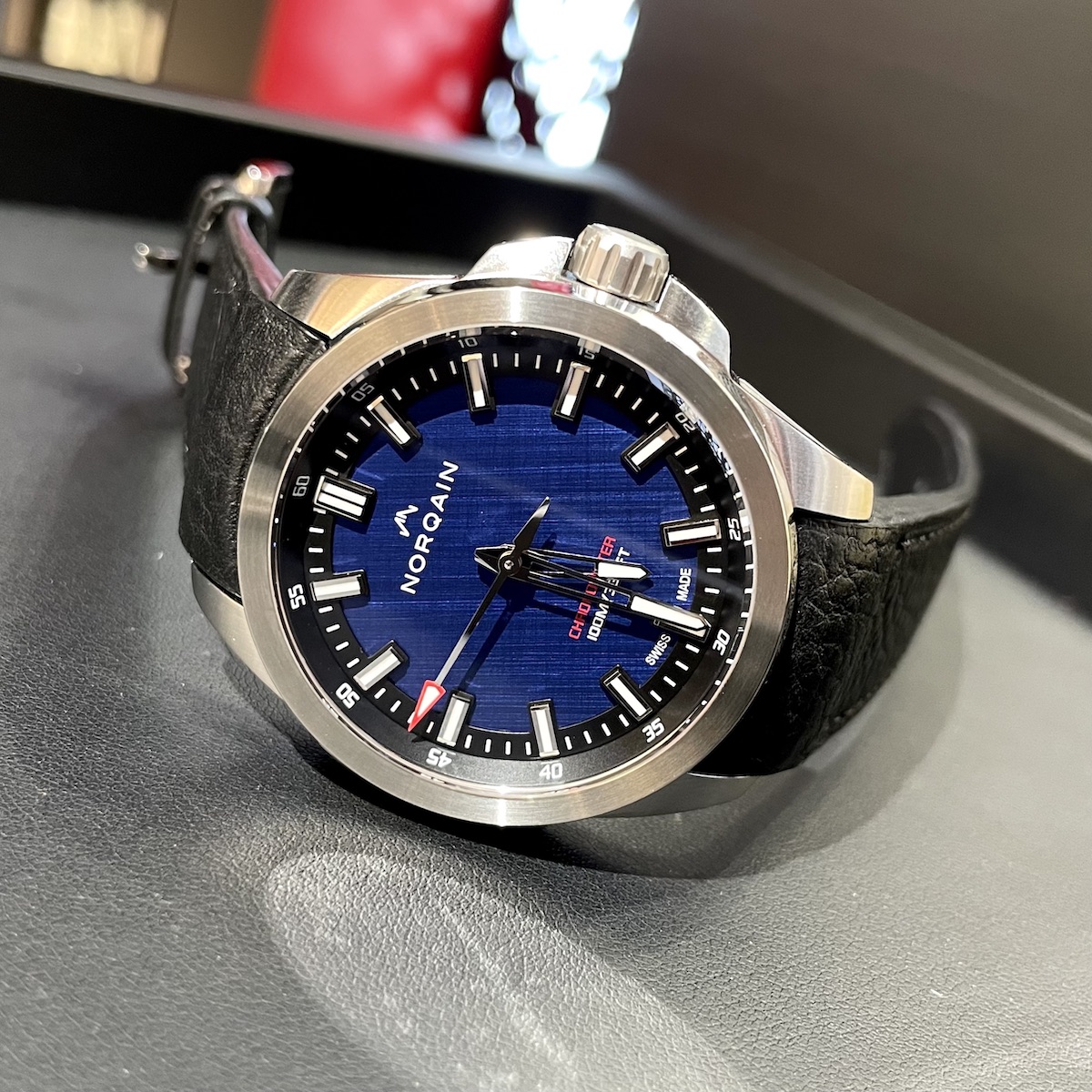実は前回インディペンデンスのグリーン文字盤が発売された際に「ブルー文字盤が出ればな…」と話しておりました。ノルケインにお気持ちが通じたのか、早くも希望が実現し早速店頭でご覧頂きました!