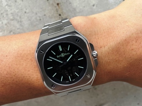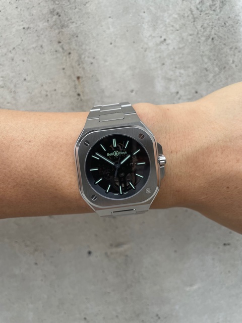 発売以来、ベルロス人気の立役者となった『BR05』シリーズ。そして、2019年から発表されている限定モデルBR05スケルトン。毎年、ほとんど店頭に並ぶ事なく完売する人気モデルが、奇跡的に西尾店に入荷して参りました!!私も生で見るのは初めて!!大興奮でした!!そしてもう、西尾店の専属モデルといっても過言ではない顧客K様に、早速お写真を撮らせていただきました!!コンクリートのバックに、緑色に発光するスーパールミノバ®C5をコーティングしたアプライドインデックスと針がよく映えます!!光の角度でスケルトンがはっきりと見えたり、下の写真のように黒っぽく見えたりと、ユニークな加工になってます!!
