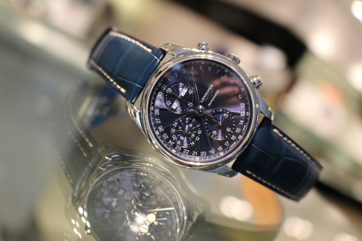 ブルーのアリゲーターレザーストラップがエレガントかつ重厚な雰囲気をまとっています!文字盤のカラーがサンレイ仕上げの深みのあるブルーなので、光を上手に取り込みながら、とても綺麗に反射するのも特徴的です。複雑な機構のトリプルカレンダーに、ムーンフェイズやクロノグラフまで搭載しているので、機械式時計の趣を存分に味わえますね!数々の時計を着けこなしてきたK様にも、綺麗な色味とエレガントな雰囲気を持つ「マスターコレクション」はぴったりハマっていました!ダンディで大人の色気漂う1本を、是非店頭でご覧下さい!K様、ご協力いただき誠にありがとうございます。