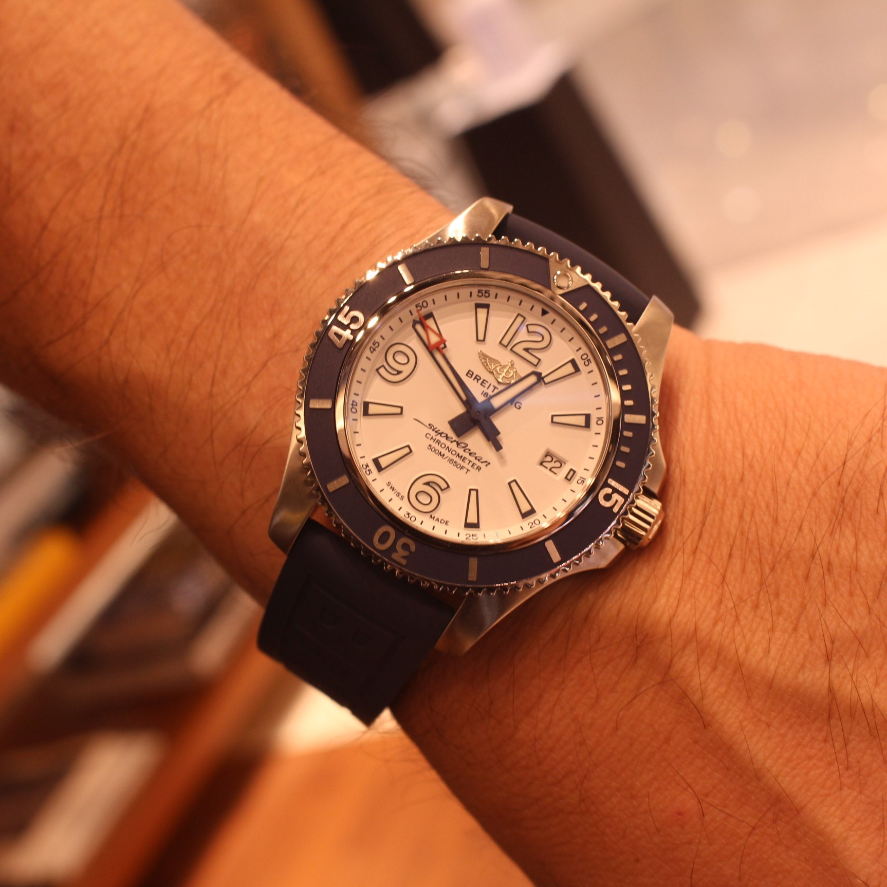 ブライトリングスーパーオーシャンでは42mmのサイズにだけ存在するこの青×白×赤の配色は、いわゆるマリンカラーで上品で爽やかな印象を受ける1本です。