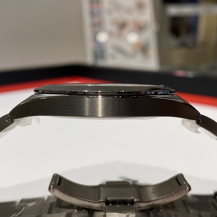 チタングレーという普段では見られないカラーの文字盤ですが、実はこちらのモデルケース・ブレス共にチタン素材でできている為、通常のジェントルマン クォーツモデルよりも軽いのです!!