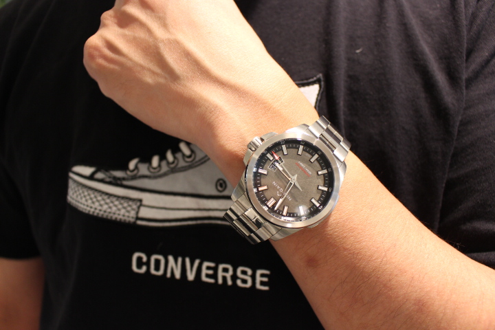 別の時計の修理でご来店下さったY様。少しの間お持ちの時計をお預かりさせて頂く事になり、腕元が寂しくなった時にたまたま出会ってしまったこちらのモデル。スポーティなケースにシンプルなデザインが魅力のインデペンデンス。一際目を引く文字盤は『オールドスチールフィニッシュ』と呼ばれ真鍮をベースに、職人さんの手仕事で削り出された文字盤は厳密には2個同じものがないところも魅力です。そして3時位置には『過去・現在・未来』を映し出す日付表示を備えております。インナーベゼルはブラックで統一されておりますが、秒針の針先が赤くアクセントになり視認性を確保してくれます。ご一緒にご来店下さった奥様も気に入って頂けた事が決め手でしたね!!オンオフ両方とお使い頂けると思いますますので、幅広く色々な雰囲気をお楽しみ下さいね!!この度は誠にありがとうございました。今後ともよろしくお願いいたします