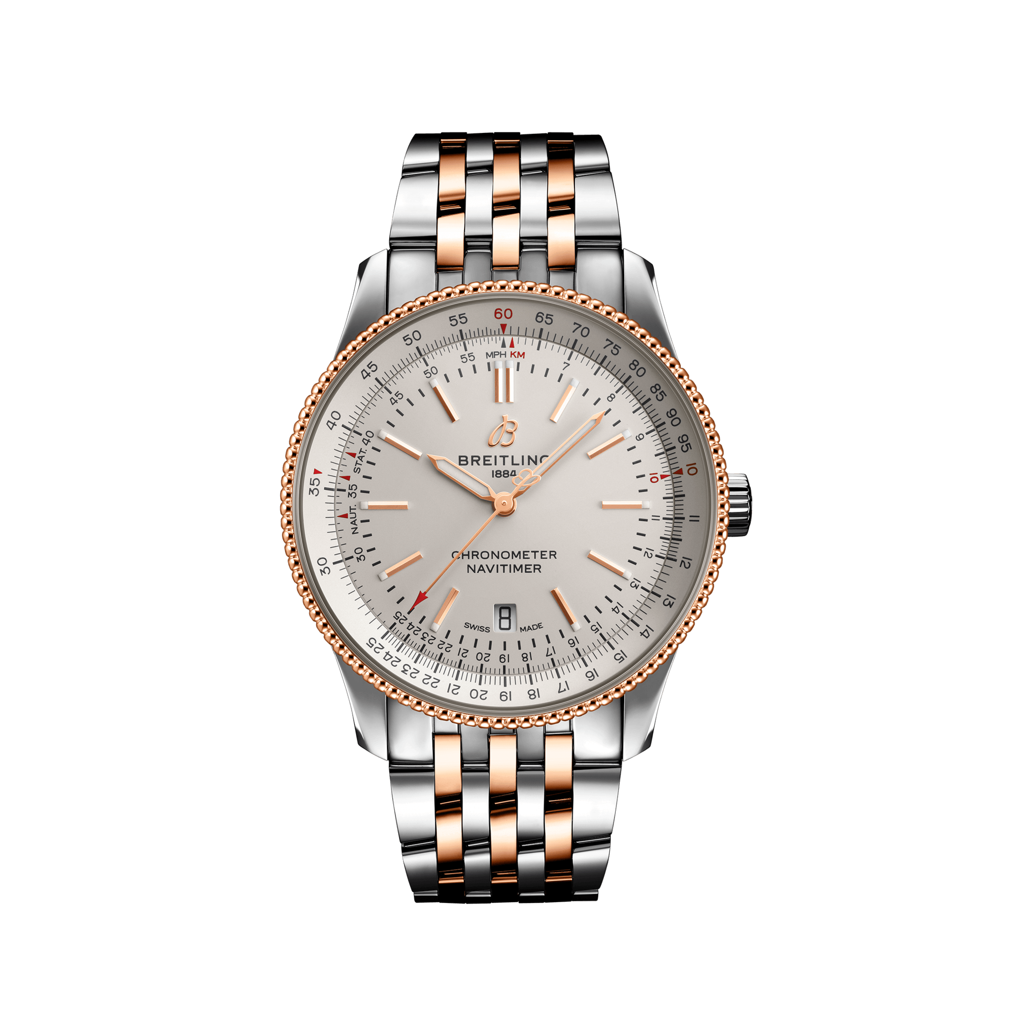 取扱店舗: 名古屋店・豊田店・西尾店・ネットブティック[ SPEC ]掲載されている商品はラインナップのご紹介となっております。カタログ番号 187775 サイズ 41mm 文字盤 シルバー 機能 3針 インデックス バー ケース素材 ステンレススチール+18Kレッドゴールド ベルト ブレスレット ベゼル 回転計算尺ベゼル 日付 日付あり 防水性 30M 動力 自動巻き