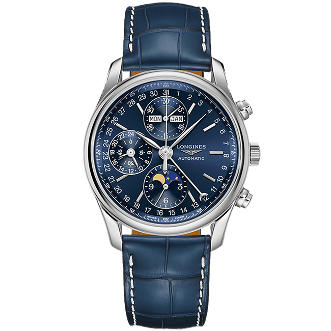 取扱店舗: 西尾店[ SPEC ]掲載されている商品はラインナップのご紹介となっております。カタログ番号 269425 サイズ 40.0mm 文字盤 ブルー 機能 クロノグラフ・ムーンフェイズ インデックス バー ケース素材 ステンレススチール ベルト アリゲーターストラップ 防水性 30M 動力 自動巻き